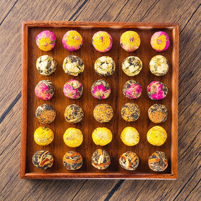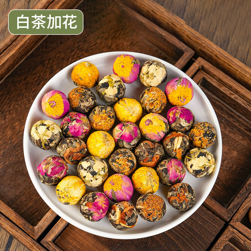 | Varieties | 1, Tangerine peel white tea ball; 2, Osmanthus white tea ball; 3, Yellow chrysanthemum white tea ball; 4, Rose white tea ball; 5, Jasmine white tea ball; 6, Peony white tea ball |