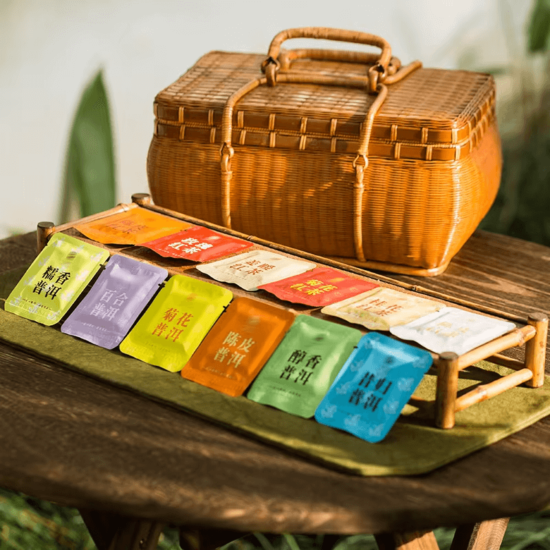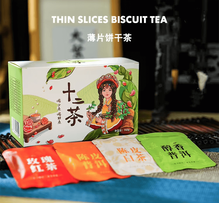 Thin Slices Biscuit Tea Thin slices biscuit tea, there are 12 flavors in total. Use selected Pu-erh tea, Yunnan red tea and white tea with edible dehydrated dried flowers, pressed into small square shape.One piece at a time, simple and convenient, the tea leaves are complete, the soup color is clean, the taste is full, and the price is affordable.